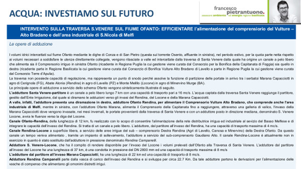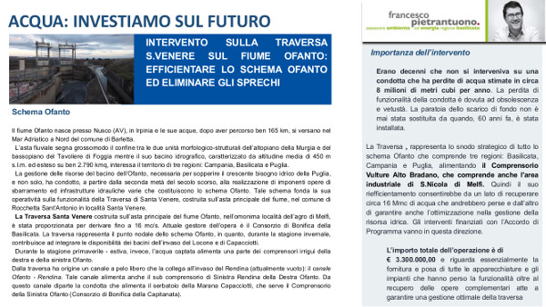 • il primo, sulla Traversa S. Venere sul fiume Ofanto, con cui sarà efficientata l’alimentazione del comprensorio del Vulture – Alto Bradano e dell’area industriale di S. Nicola di Melfi;