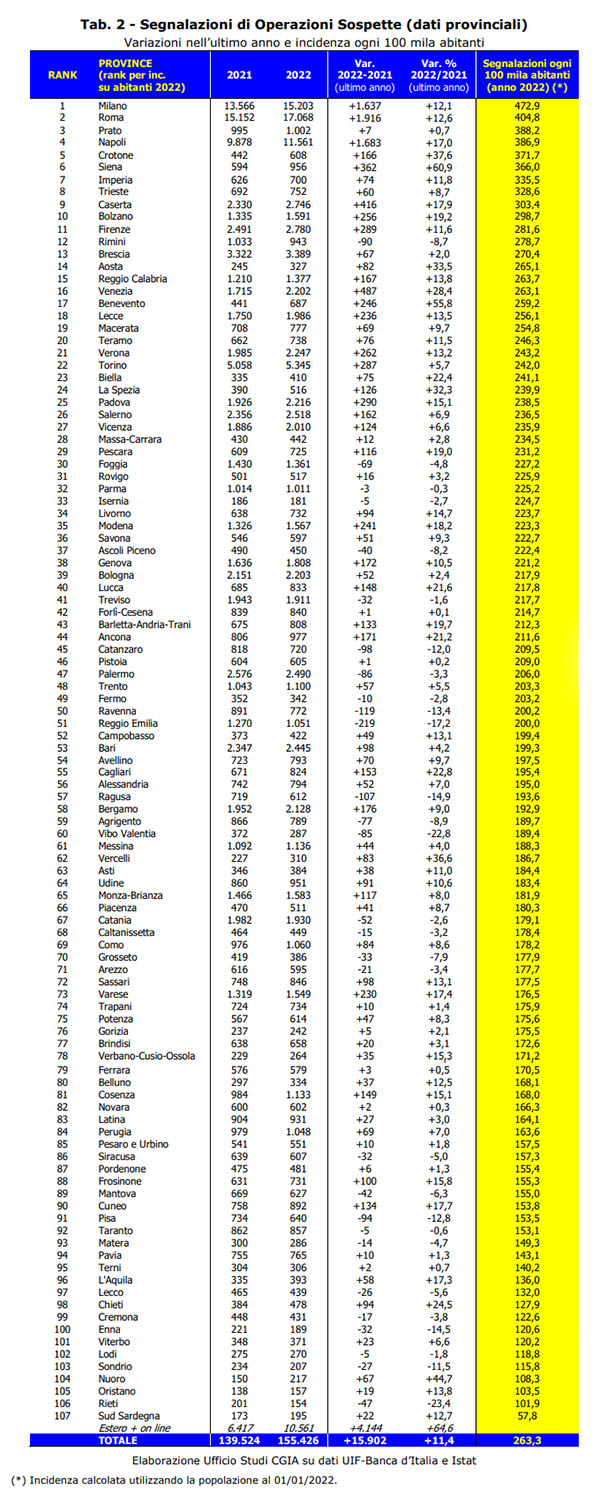 Nel 2022 il numero di operazioni sospette (SOS) pervenute all’Unità di Informazione Finanziaria (UIF) della Banca d’Italia ha toccato il record storico di 155.426 segnalazioni (vedi Graf. 1).