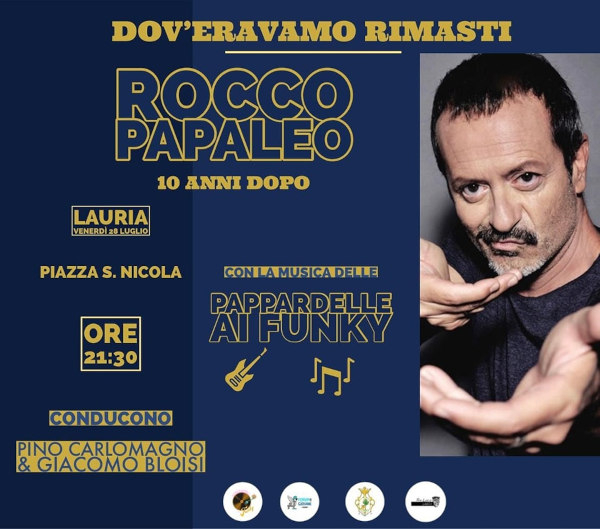“Dopo un decennio dall’ultimo strepitoso incontro in Piazza S. Nicola, Rocco Papaleo, torna ad incontrare la sua Lauria, nella stessa piazza, in un evento che si preannuncia ricco della sua ironia, della sua arte, delle mille sfaccettature del personaggio Papaleo e dell’amico di sempre Rocco, che torna a raccontarci quante cose sono avvenute, cambiate, tornate con altri 10 anni di carriera alle spalle, tra cinema, teatro e tv.
