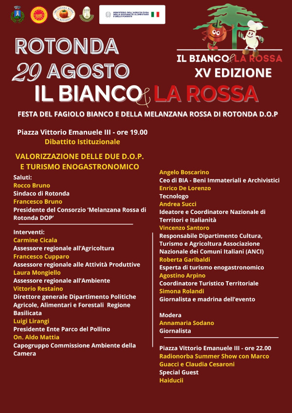 Talk, show cooking, degustazioni, musica e animazione dal vivo, sono questi gli ingredienti della quindicesima edizione de ‘ il Bianco e la Rossa’ la manifestazione che Rotonda dedica ai suoi prodotti Dop, la melanzana rossa e il fagiolo bianco, organizzata dai due Consorzi di tutela assieme all’amministrazione comunale, alla Regione Basilicata e al Ministero dell’Agricoltura, della Sovranità Alimentare e delle Foreste.