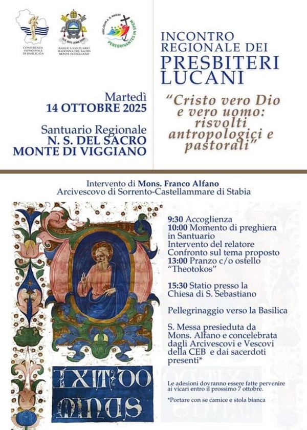 “Cristo vero Dio e vero uomo: risvolti antropologici e pastorali” è il tema dell’Incontro regionale dei Presbiteri Lucani che si terrà Martedì 14 Ottobre 2025 al Santuario Regionale N. S. del Sacro Monte di Viggiano.