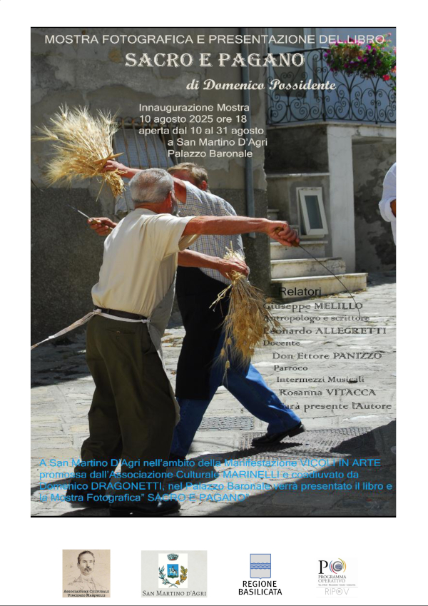 In largo S. Lorenzo, dopo i saluti istituzionali del sindaco di San Martino d’Agri Mario, A. Imperatrice e del presidente dell’Ass. Culturale V. Marinelli Giuseppe CONTE, avrà luogo la presentazione del libro fotografico di Domenico POSSIDENTE “SACRO E PAGANO” a cui seguirà il CONVEGNO: “ANTICHI RITI, FEDE E SPIRITUALITA” NELLE FESTE POPOLARI”.