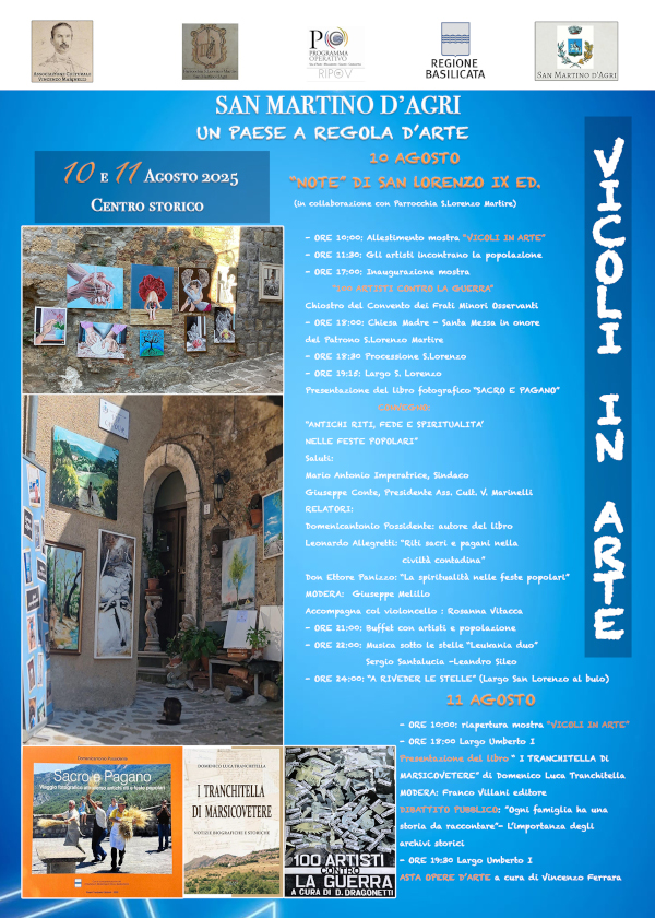 Per 2 giorni il centro storico di San Martino d’Agri si trasformerà in un suggestivo palcoscenico a cielo aperto, dove decine di artisti (pittori, scultori, musicisti, fotografi, artigiani, scrittori) saranno ospitati ed animeranno il borgo per 2 giorni, allestendo mostre, spettacoli musicali e di animazione, laboratori, realizzando opere in Plein Air, sempre interagendo con gli abitanti locali.