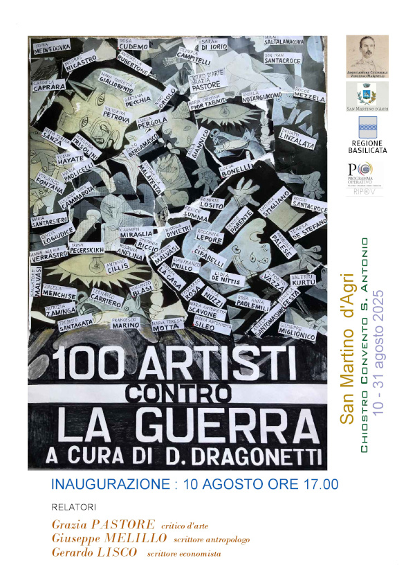 Il pomeriggio del 10 agosto sarà inaugurata la mostra “100 ARTISTI CONTRO LA GUERRA”, allestita nel bellissimo Chiostro del Convento di S. Antonio,