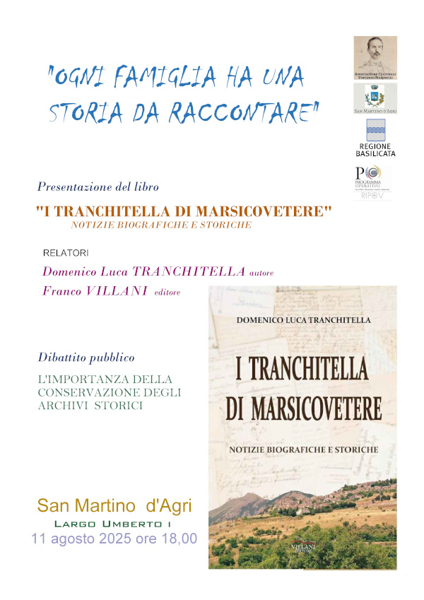 Alle ore 18 in Largo Umberto I e’ prevista la presentazione del libro di Domenico Luca TRANCHITELLA : “I TRANCHITELLA DI MARSICOVETERE”, accompagnato dal dibattito pubblico “Ogni famiglia ha una storia da raccontare – L’importanza della conservazione degli archivi storici”.