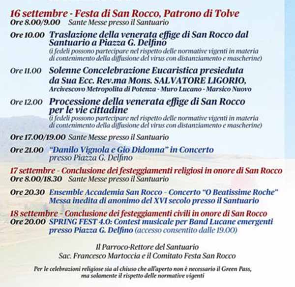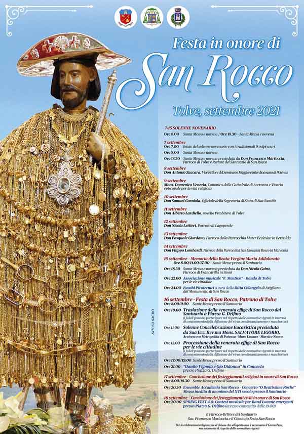 Tra i tanti paesi della nostra Regione in cui il San Rocco è venerato e festeggiato, il primo posto è certamente riconosciuto a Tolve, paese che vanta una lunga e vivace tradizione del culto per il Santo che ogni anno richiama (nella duplice ricorrenza del 16 Agosto e 16 Settembre) decine di migliaia di pellegrini da tutta la regione e dalle regioni vicine, come testimoniano le migliaia di ex voto conservati nella “Casa del Pellegrino”.