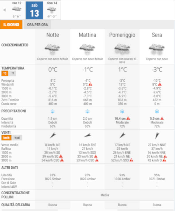 Secondo gli esperti di 3bmeteo, domani, Sabato 13 Febbraio, avremo cielo coperto con neve il mattino e la sera, con nevicate più intense nel pomeriggio.