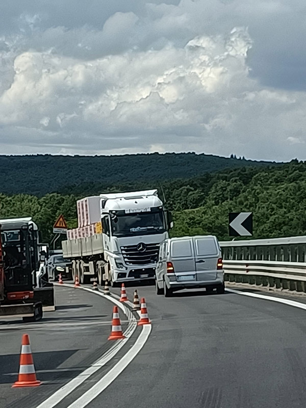 Semaforo verde, partiamo e vediamo salire in senso contrario di marcia tre autoarticolati e due auto e così per evitare un frontale, siamo stati costretti a fermarci sul ponte (lato cantiere) per far passare chi saliva (forse mezzi che si sono incolonnati ad altri con semaforo rosso già scattato, oppure per colpa del semaforo mal sincronizzato).