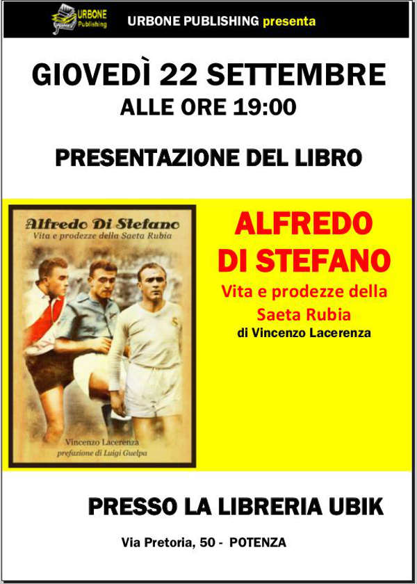 Stasera alle ore 19:00 presso la Libreria Ubik di via Pretoria a Potenza, ci sarà la presentazione del libro “Alfredo Di Stefano – Vita e prodezze della Saeta Rubia” scritto dal potentino Vincenzo Lacerenza.