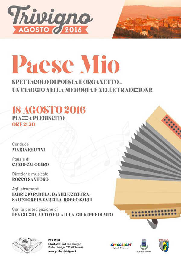 Oggi sarà la volta di “Paese mio”, spettacolo di poesia e organetto: viaggio nella memoria e nelle tradizioni della Lucania, la sua gente, il territorio, l’emigrazione e il brigantaggio.