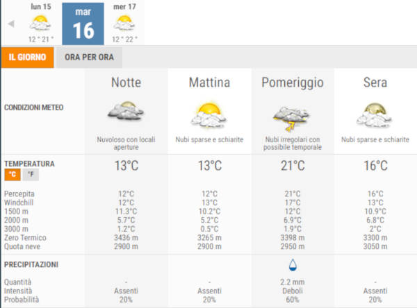 La temperatura massima registrata sarà di 21°C, la minima di 13°C.