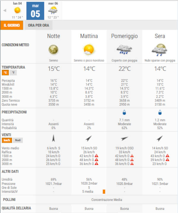 Secondo gli esperti di 3bmeteo, domani, Martedì 5 Ottobre, avremo cielo sereno o poco nuvoloso il mattino, coperto con pioggia il pomeriggio e nubi sparsi con pioggia la sera.