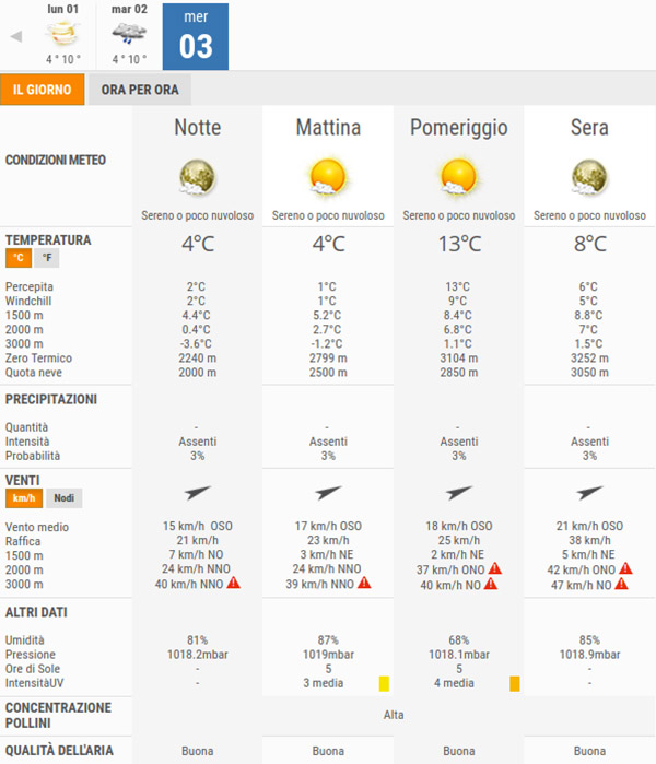 La temperatura massima registrata dovrebbe essere di 13°C, la minima di 4°C.