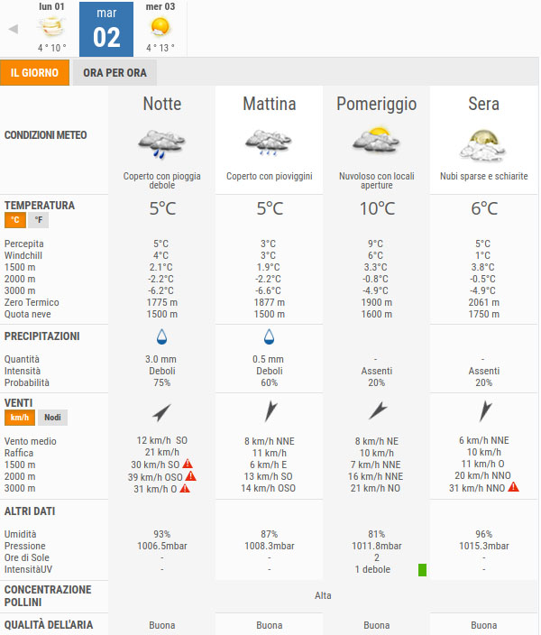 Secondo gli esperti di 3bmeteo, domani, Martedì 2 Febbraio, avremocieli molto nuvolosi al mattino con deboli piogge.