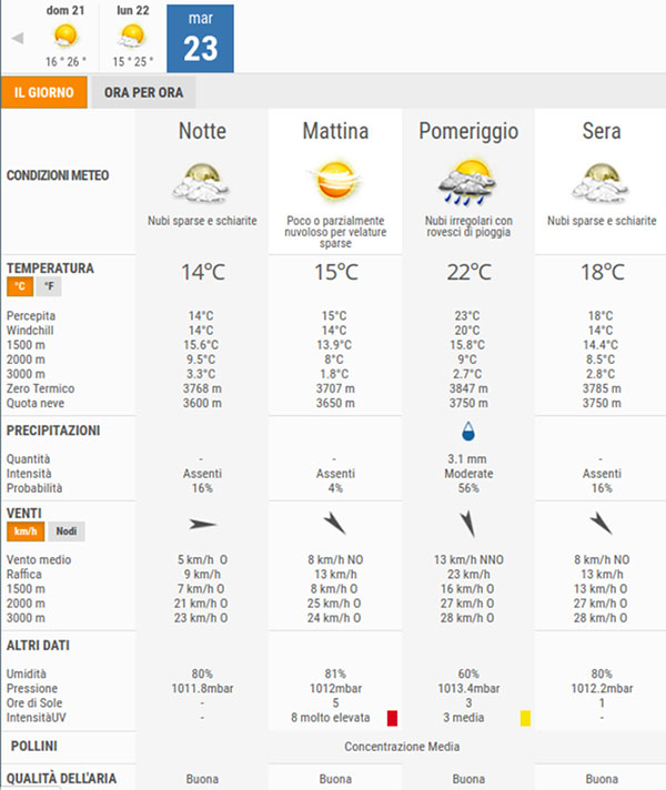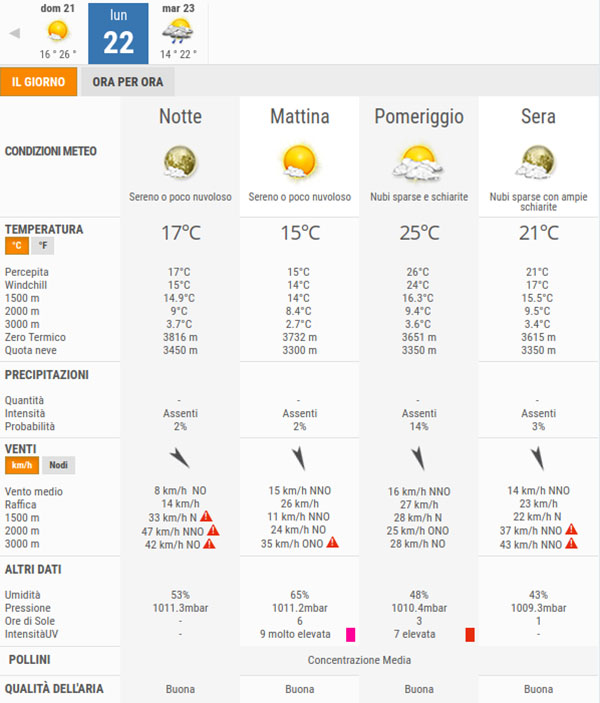 Secondo gli esperti di 3bmeteo, domani, Lunedì 22 Agosto, avremo cieli in prevalenza poco nuvolosi, salvo variabilità nelle ore centrali della giornata, non sono previste piogge.