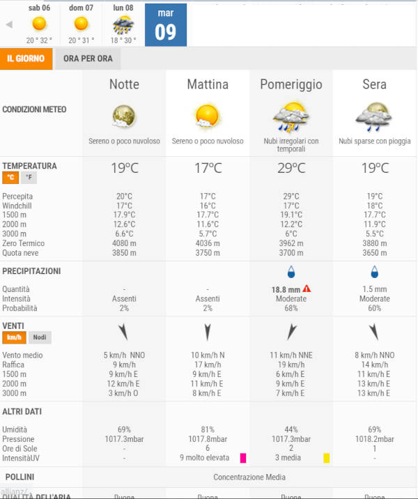 Martedì 9 Agosto, invece, avremo cieli in prevalenza poco nuvolosi al mattino, ma con rapido aumento della nuvolosità con piogge e rovesci anche temporaleschi dal pomeriggio.