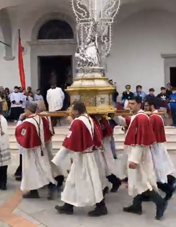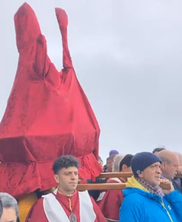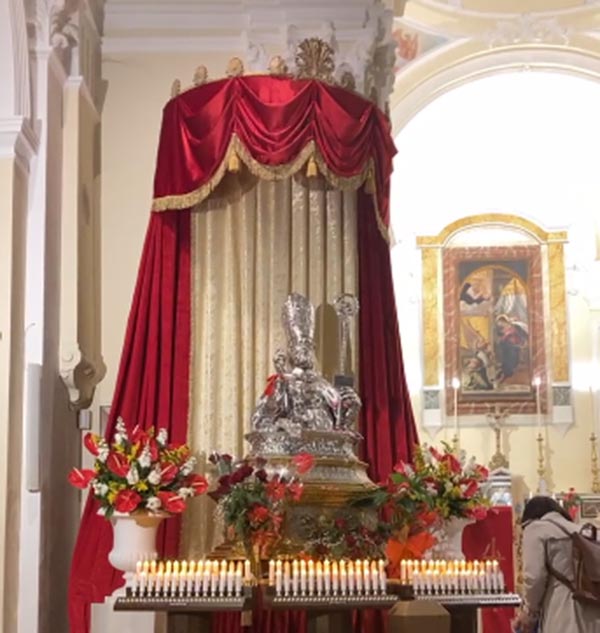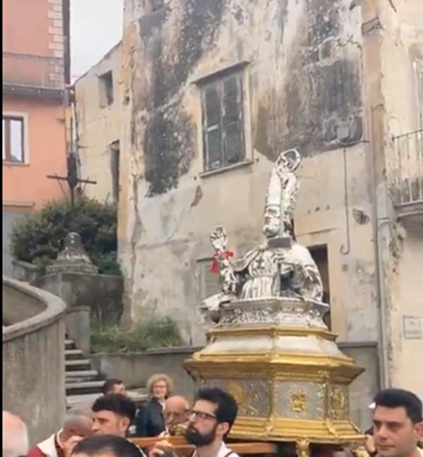 La statua, portata a spalla dai devoti, viene coperta con un mantello rosso porpora, colore del martirio e della dignità vescovile.