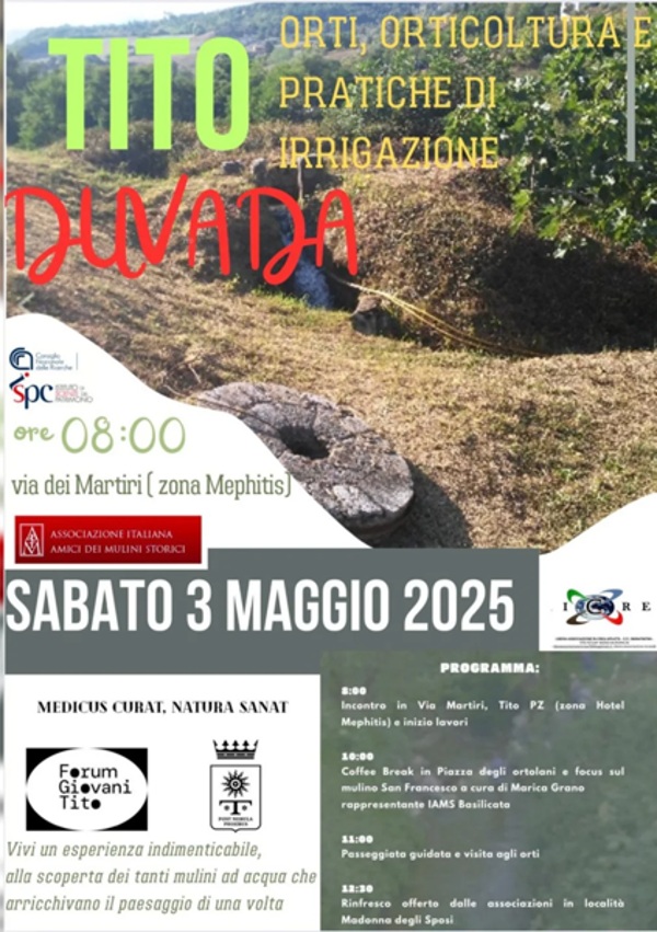 Con l’avvio del Mese Europeo dei Mulini 2025, promosso in Italia dall’Associazione Amici dei Mulini Storici AIAMS e giunto alla sua 14ª edizione, torna anche la nuova edizione della “Duvada” a Tito (PZ), un evento ideato nel 2015 dalla Libera Associazione RiCrea APS con la collaborazione del Forum dei giovani di Tito, intervenuti da qualche anno a sostegno degli storici ortolani.