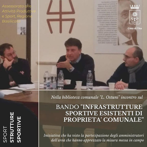 Si è tenuto Mercoledì pomeriggio nella biblioteca comunale “L. Ostuni” di Tito un incontro dei sindaci dell’area con l’assessore regionale alle Attività Produttive e Sport, Alessandro Galella, e il dott. Bernardo del Dipartimento Att. Produttive, rispetto al bando per le infrastrutture sportive esistenti di proprietà comunali, pubblicato dalla Regione Basilicata.