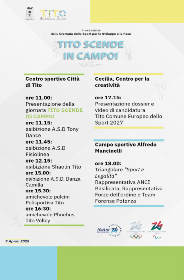 La presentazione ufficiale del dossier e del video di candidatura avverrà Domenica 6 Aprile 2025 in occasione della Giornata Internazionale dello Sport e la Pace, con un evento che trasformerà Tito in una vera e propria Città dello sport per un’intera giornata.