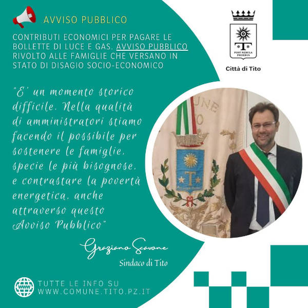 Sono le parole di Graziano Scavone, sindaco della Città di Tito, nel presentare l’Avviso Pubblico diramato dal Comune, inerente la possibilità di accedere contributi economici per pagare le bollette di luce e gas.