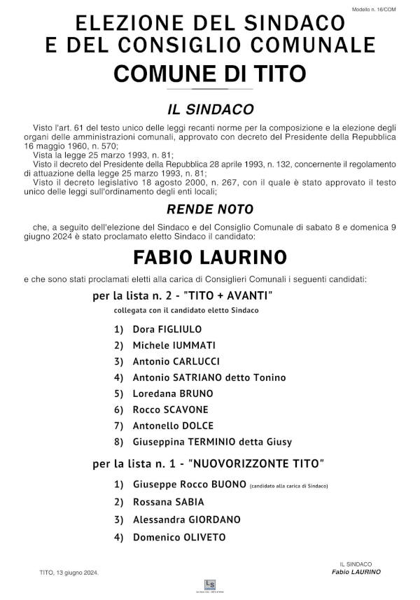 “A seguito dell’elezione del Sindaco e del Consiglio Comunale di sabato 8 e domenica 9 giugno 2024 è stato proclamato eletto Sindaco il candidato FABIO LAURINO e che sono stati proclamati eletti alla carica di Consiglieri Comunali i candidati riportati nel seguente manifesto”.