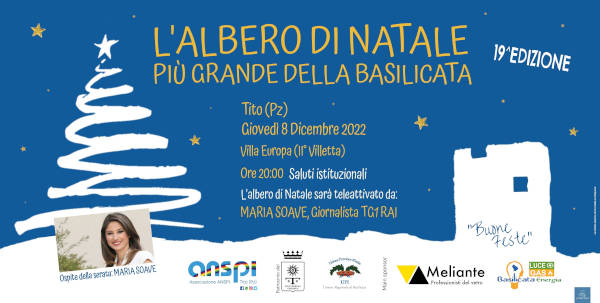 “L’albero di Natale più grande della Basilicata, illuminerà, come da tradizione, il nostro territorio durante il periodo natalizio, facendo da cornice ad una serie di eventi, che arricchiscono il cartellone de ‘LA BIANCA STAGIONE DI TITO’, destinati sia alla comunità titese che ai visitatori che avranno piacere di raggiungere la nostra cittadina durante le festività.