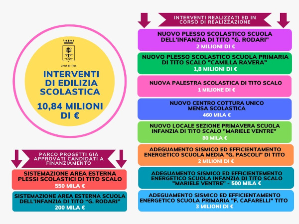 “Ecco perché attraverso una attenta e calibrata pianificazione degli interventi, la destinazione di risorse di bilancio comunale unitamente alla capacità di intercettare finanziamenti da altri enti, una collaborazione strategica ed essenziale con la dirigenza e la comunità scolastica, si è riusciti in questi anni a realizzare un intenso programma con circa 11 milioni di euro di investimenti in materia di edilizia scolastica, costruendo tre nuovi plessi e adeguando sismicamente tutti i plessi scolastici, mantenendo nel centro urbano la vita scolastica e garantendo a Tito scuole sicure, moderne ed efficientate senza mai interrompere la continuità didattica.