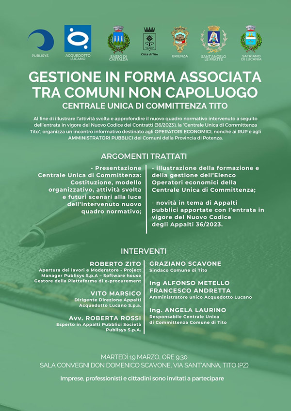 Al fine di illustrare l’attività svolta e approfondire il nuovo quadro normativo intervenuto a seguito dell’entrata in vigore del Nuovo Codice dei Contratti (36/2023), a Tito per Martedì 19 Marzo è stato organizzato un importante incontro della “Centrale Unica di Committenza Tito”.