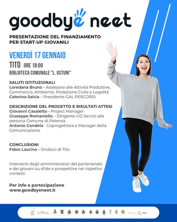 Venerdì 17 Gennaio 2025, alle ore 18:00, presso la Biblioteca Comunale “L. Ostuni”, verrà presentato il finanziamento di start-up giovanili nell’ambito dell’Avviso Giovani e Impresa, Progetto GoodBYE Neet a cui il Comune di Tito ha aderito.