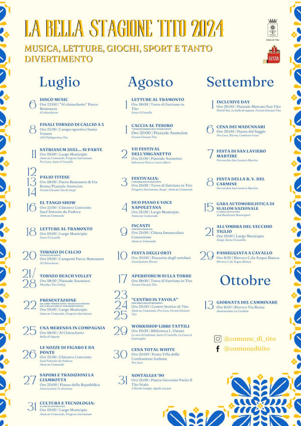 - L’11 luglio, alle ore 19, in Largo Municipio, verrà presentata la campagna di scavo 2024 con una cena comunitaria realizzata in collaborazione con la Pro Loco di Tito e l’associazione Sotto il Castello.