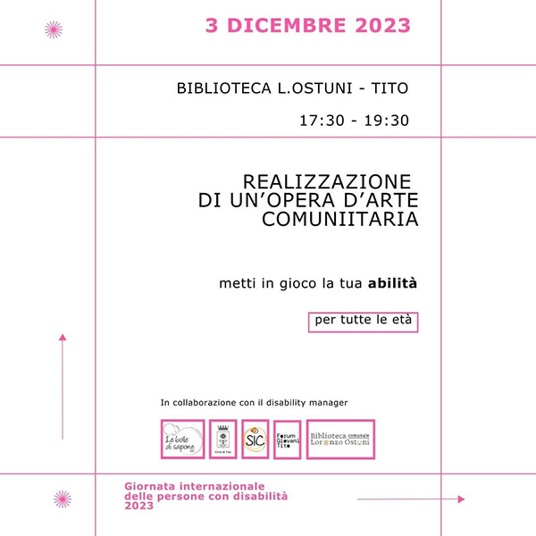 È questo l’intento dell’iniziativa che il Comune di Tito, di concerto con il Disability Manager Gerardo Laurenzana, il Forum dei Giovani di Tito e le associazioni “Le Bolle di Sapone” e “Sotto il Castello”, proporrà Domenica 3 Dicembre, dalle ore 17:30 alle ore 19:30, nei locali della Biblioteca Comunale “L. Ostuni” di Tito.