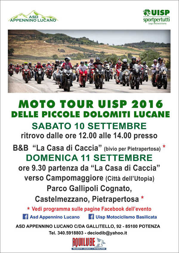 Oggi e domani è in programma il “Moto tour Uisp 2016 delle piccole Dolomiti Lucane” con l’obiettivo di svolgere attività di turismo sportivo, promuovere la conoscenza del territorio, delle sue bellezze naturali e del patrimonio storico ed artistico della Basilicata, valorizzare e riqualificare l’immagine di territori e centri non a forte vocazione turistica e promuovere un flusso turistico destagionalizzato.