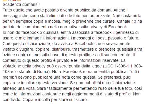 Sta girando su Facebook un messaggio che garantisce sicurezza sulla privacy a coloro che pubblicheranno il seguente messaggio: