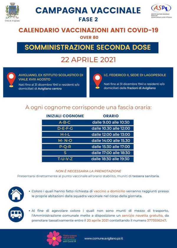• Avigliano, Ex Istituto scolastico di Viale XVIII Agosto. Nello specifico dovranno recarsi in sede i nati fino al 31 Dicembre 1941 e/o domiciliati di Avigliano centro;