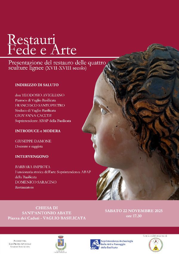 Il 22 novembre p.v.., alle ore 17.30, presso la chiesa di Sant’Antonio Abate in Vaglio Basilicata, saranno presentati i lavori di restauro di quattro sculture lignee.