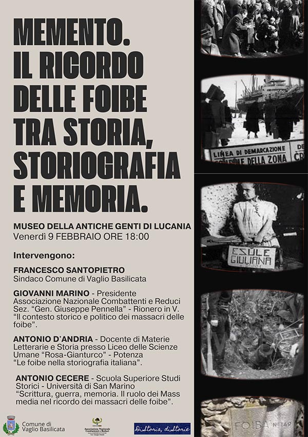 In prossimità del “Giorno del Ricordo” in onore delle Vittime Italiane delle Foibe si svolgerà a Vaglio Basilicata, nel tardo pomeriggio di Venerdì 9 Febbraio con inizio alle ore 18:00 presso il Museo delle Antiche Genti di Lucania, il convegno dal tema “Memento. Il Ricordo delle Foibe tra Storie, Storiografia e Memoria” e con lo stesso evento, come già detto in programma proprio alla vigilia del “Giorno delle Ricordo”, promosso ed organizzato in stretta sinergia collaborativa tra il Comune di Vaglio Basilicata, l’Associazione Nazionale Combattenti e Reduci “Gen. Giuseppe Pennella” di Rionero e il blog “Di Storia, di Storie”.