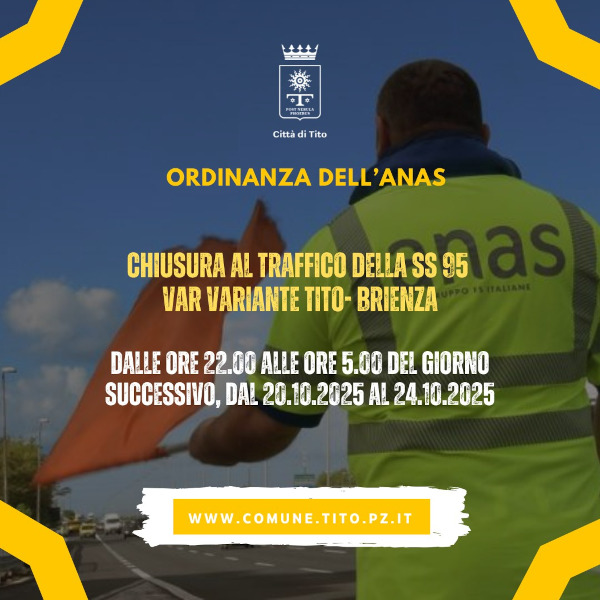 Si comunica che con apposita ordinanza, Anas ha disposto la chiusura al traffico della SS 95 Var Variante Tito-Brienza: