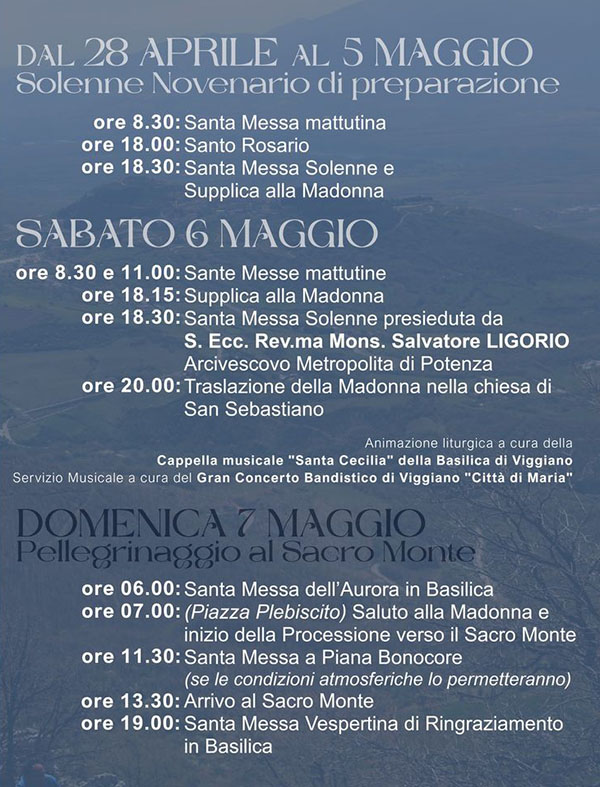 Ecco il programma, a cura del Santuario Regionale della Basilicata, delle manifestazioni religiose che si svolgeranno oggi, Domenica 7 maggio 2023.