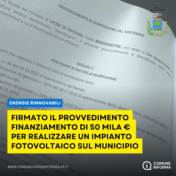 Si tratta di un importo che verrà utilizzato per un progetto nell’ambito dell’energia da fonti rinnovabili, con la realizzazione di un impianto fotovoltaico da installare sulla sede del Municipio in viale Tracciolino.