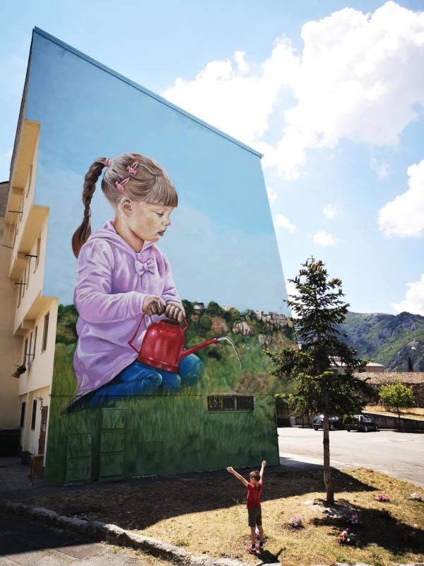 Ritrae una bambina mentre annaffia la sua terra, simbolo del rispetto dell’ambiente, dell’appartenenza alla propria storia ed esempio di purezza e legalità.