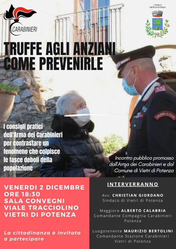 Venerdì 2 dicembre, alle ore 18:30 presso la sala convegni di Vietri di Potenza, in viale Tracciolino, si terrà un incontro promosso dai Carabinieri della Compagnia di Potenza e dal Comune di Vietri di Potenza, dal titolo “Truffe agli anziani: come prevenirle”.