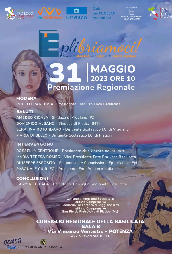 È in programma mercoledì 31 maggio 2023 alle ore 10 presso la Sala “B” del Consiglio regionale della Basilicata la cerimonia di premiazione del concorso nazionale Eplibriamoci indetto da Ente Pro Loco Italiane in occasione della Giornata Mondiale Unesco del Libro e del Diritto d’autore.